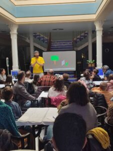 A las 11 se dio la bienvenida y se realizó una pequeña presentación sobre Filmoteca Española. A continuación, se dio paso a Alberto, quien estuvo explicando la fotografía en movimiento, que consiste en poner una foto tras otra creando un efecto visual de movimiento. Los asistentes aprendieron que se deben poner mínimo 24 imágenes por segundo para que el ojo perciba el movimiento fluido, es decir, sin cortes. Se proyectaron algunos videos de ejemplos para que se pudiera ver el efecto de variar el número de las imágenes por segundo. También explicó que por las propiedades físicas de la luz, la cámara proyecta a la inversa, es decir, lo que sale a la derecha se proyecta en el izquierda o lo de arriba se proyecta abajo.