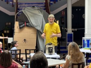 Todo quedó preparado para que a las 11:00h de la mañana diera comienzo la actividad. Después de una breve introducción de bienvenida y presentación de dónde y porqué estábamos allí un domingo a esas horas de la mañana, que realizó Alberto de Siena Educación, se dio paso al otro Alberto, el creador del proyecto Ecocam Fotografía Reciclada y que forma parte del laboratorio fotográfico y social Contado Pierde, quien explicó la técnica de la fotografía y del revelado fotográfico. Vino acompañado de varias cámaras antiguas artesanales –que se utilizan para hacer fotografía minutera- para explicar algunos conceptos de fotografía, por ejemplo, cómo la luz que se refleja en cada objeto, en un instante, cuando se abre el obturador de la cámara, esta luz impregna un papel de fotografía.