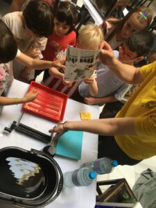 El domingo 12 fue un día espléndido de mayo de 2024, en el que tuvo lugar una nueva actividad de Filmoteca en Familia en el Cine Doré. Consistió en aprender la magia del revelado fotográfico y por ende la mecánica de cómo, no hace mucho tiempo, se filmaban las películas de cine.