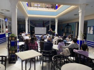 La actividad se inició a las 11:00h en el hall de la cafetería, espacio habitual de las actividades, con una presentación y explicación de los orígenes y trayectoria del cine musical, y cómo la danza/baile/coreografías musicales intervienen como recursos creativos y expresivos importantes en el género musical cinematográfico. Gracias a diferentes fragmentos de películas se pudo apreciar cómo eran las coreografía en tiempos de Fred Astaire & Ginger Rogers y cómo son en las películas actuales tales como Explota Explota (2020) y el musical “Matilda» (2022). De esta última se mostró un Making off de escenas de números musicales que se filmaron con niños y niñas de las mismas edades que los asistentes. La coreografía a desarrollar en esta actividad se iba a basar en esta música.