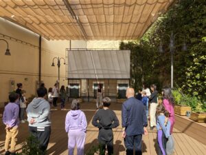 El domingo 17 de marzo de 2024, justo una semana antes de las vacaciones de Semana Santa, tuvo lugar una nueva actividad inédita de Filmoteca en Familia en el Cine Doré. Consistió en la realización del taller “Mis primeros pasos en una coreografía musical”, impartido por Macarena Carrillo, bailarina profesional y actriz de teatro clásico y musical, con experiencia demostrada en programas de coreografía con participantes jóvenes. En esta ocasión, gracias a que el tiempo nos lo permitió, la actividad se impartió al aire libre, en el espacio que el Cine Doré utiliza para las proyecciones de cine de verano. Dado que era una actividad de cierta actividad física, disponer de este entorno fue estupendo.