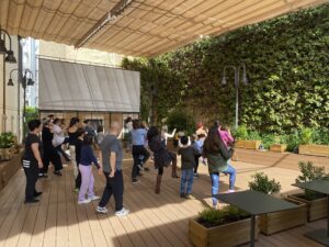 Una vez empapados de esta información y explicada la propuesta de coreografía a realizar, todos los asistentes accedieron a la terraza del cine de verano, donde, gracias a que estaba desplegado el toldo, el estupendo sol que había salido esa mañana de domingo no molestaba a los y las “bailarines”.