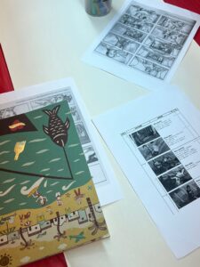 Más tarde visitamos “la isla de los objetos y mensajes”, donde cada participante eligió un objeto y una frase que le llamaran la atención. A partir de esa combinación, pensaron un posible título o el inicio de una historia. También hicimos un ejercicio colectivo de improvisación que consistía en completar frases como “Esta es la historia de…” o “hasta que un día…”, comprendiendo que toda narración tiene un inicio, un desarrollo y un desenlace.