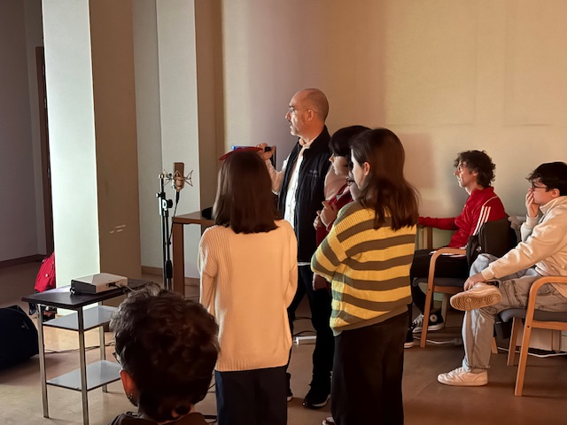 En la parte práctica del taller, los niños se preparan para doblar una escena. Aprenden el texto, ensayan la interpretación y finalmente graban sus voces. El técnico de sonido se encarga de ajustar y cuadrar las voces con la imagen, y al final todos pueden escuchar el resultado final, descubriendo cómo suena su propia voz doblando a un personaje.