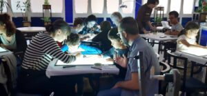 Con todos los participantes absortos en las explicaciones y en el milagro de la técnica del cine analógico, Deneb y Andrea repartieron entonces diversas tiras de películas transparentes de 16 milímetros para que los niños dibujaran ellos mismos sobre los fotogramas con rotuladores especiales. Había que ser cuidadosos para que luego esos dibujos pudieran reconocerse en la pantalla de cine. Durante un buen rato los pequeños cineastas dibujaron sus líneas, sus estrellas, sus figuras de colores y una vez completadas todas las películas Deneb y Andrea empalmaron cada una de ellas para poderlas proyectar en la pantalla.